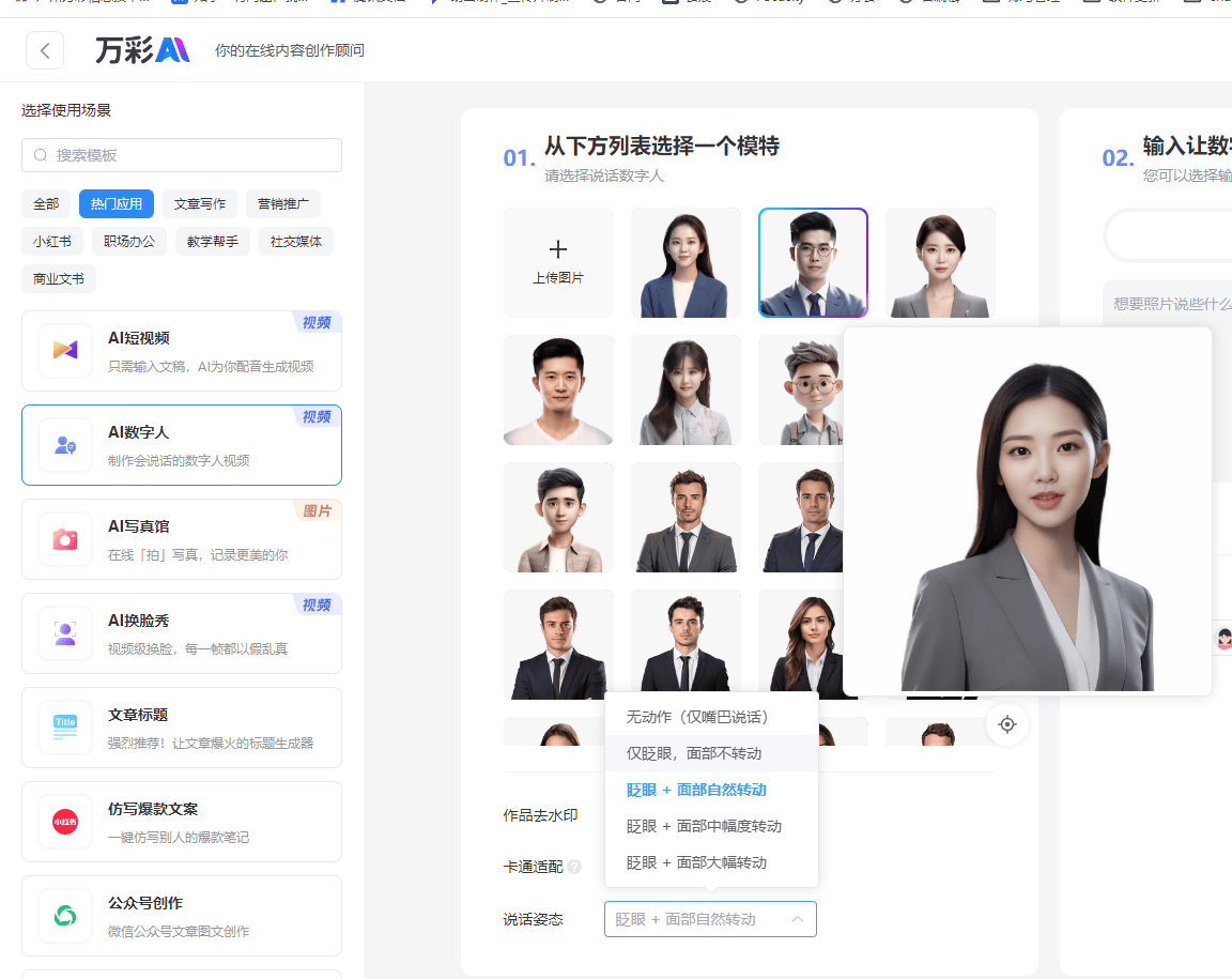 我们有来由相信,通过锻炼,只需正在线上传本人的照片或选择万彩AI供给的数字人脚色,让制做逼实且智能的数字人抽象变得触手可及。数字人能理解和回应人类指令?